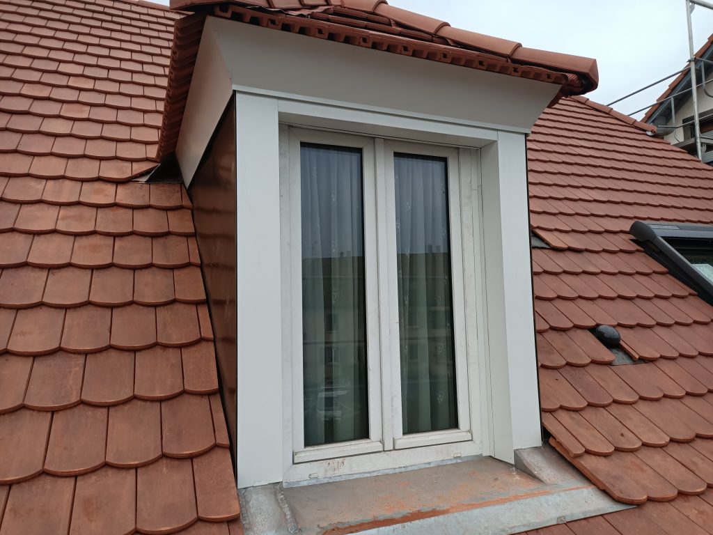 L’abergement de la lucarne est fait en zinc naturel et elle est habillé d’alu laqué blanc, avec les joues en alu laqué marron.
